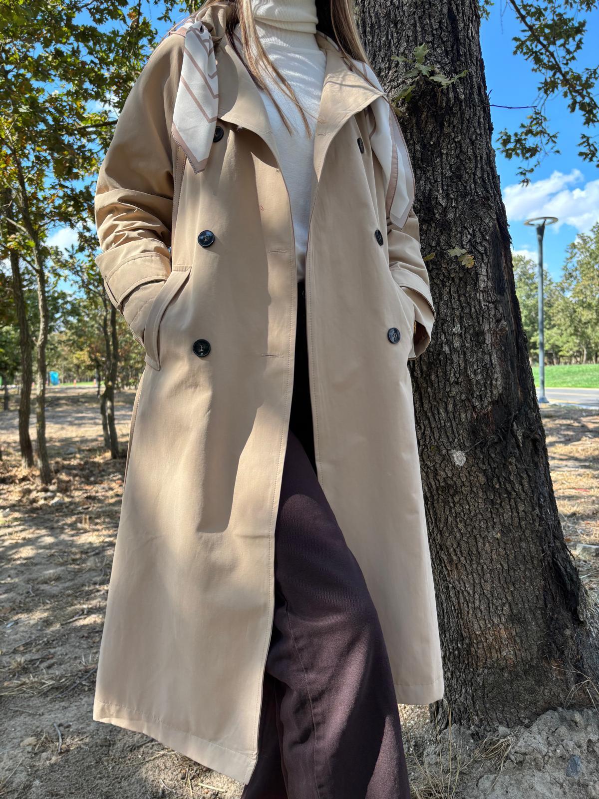 Bej Fularlı Uzun Trençkot